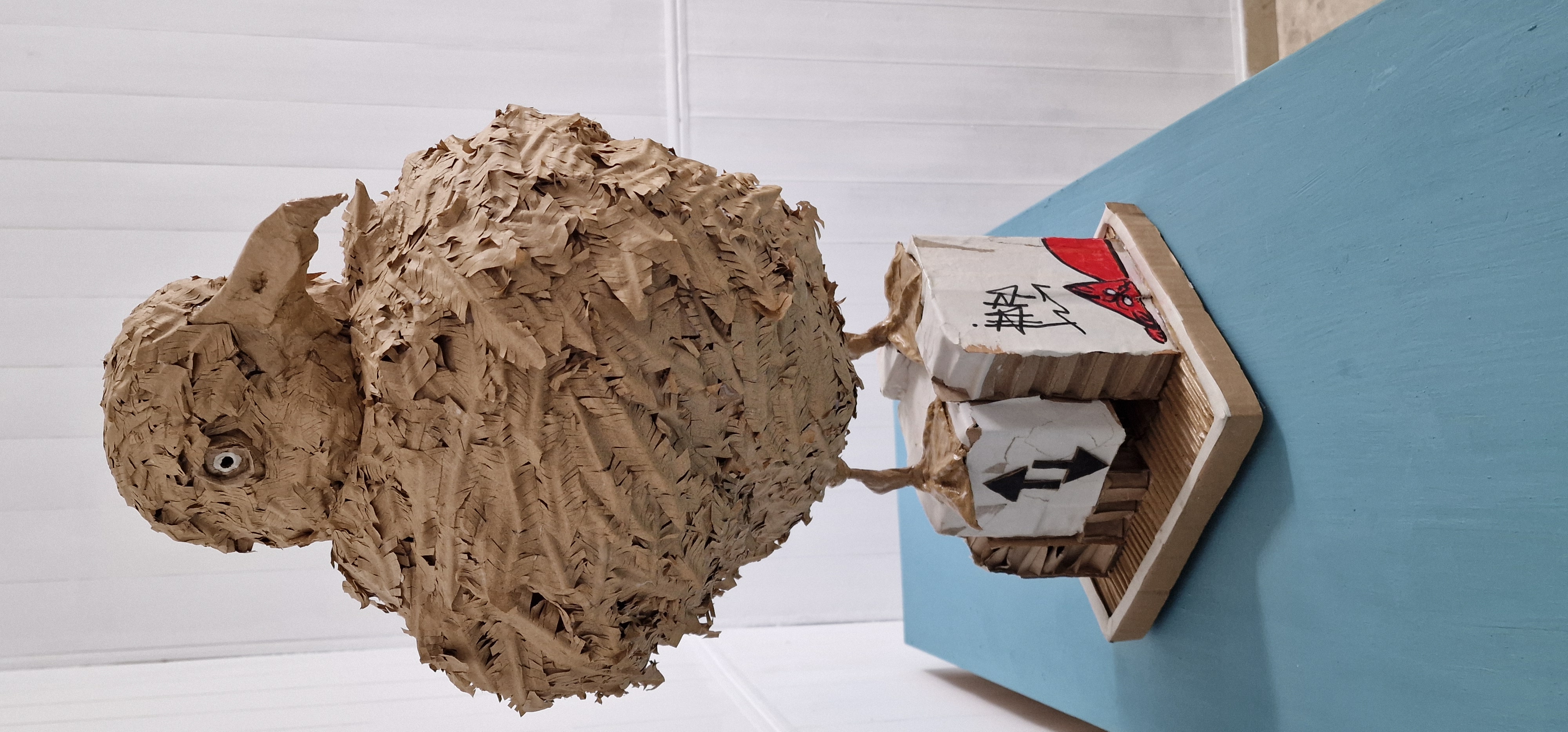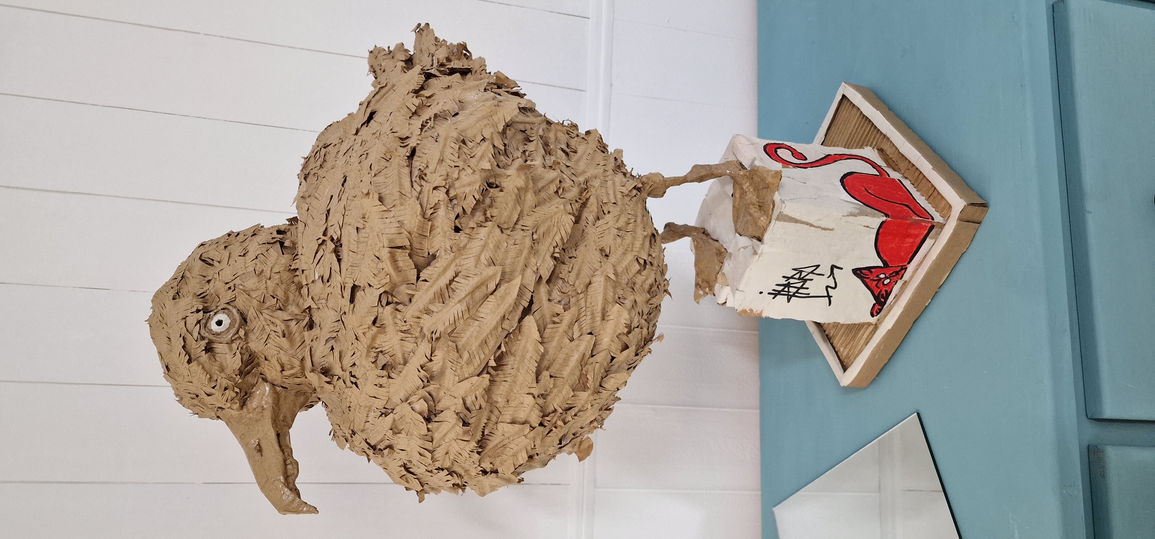 This sculpture is a whimsical exploration of contrasts, bringing to life a bird made from humble cardboard, a material often overlooked for its fragility and transience. The intricate layering of cut cardboard strips creates a textured plumage that captures the essence of the bird’s form, evoking both its delicate nature and its inherent strength. The meticulous craftsmanship imbues the piece with a sense of vitality, as though the bird might take flight at any moment.
